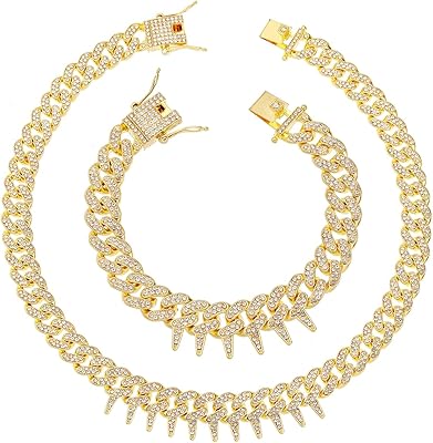 HH BLING EMPIRE Mens Gold Silver Plated Spike Cuban Link Chain Necklace and Bracelet Sets, Chunky Iced Out Diamond Miami Cuban Link Chains Hip Hop Jewelry